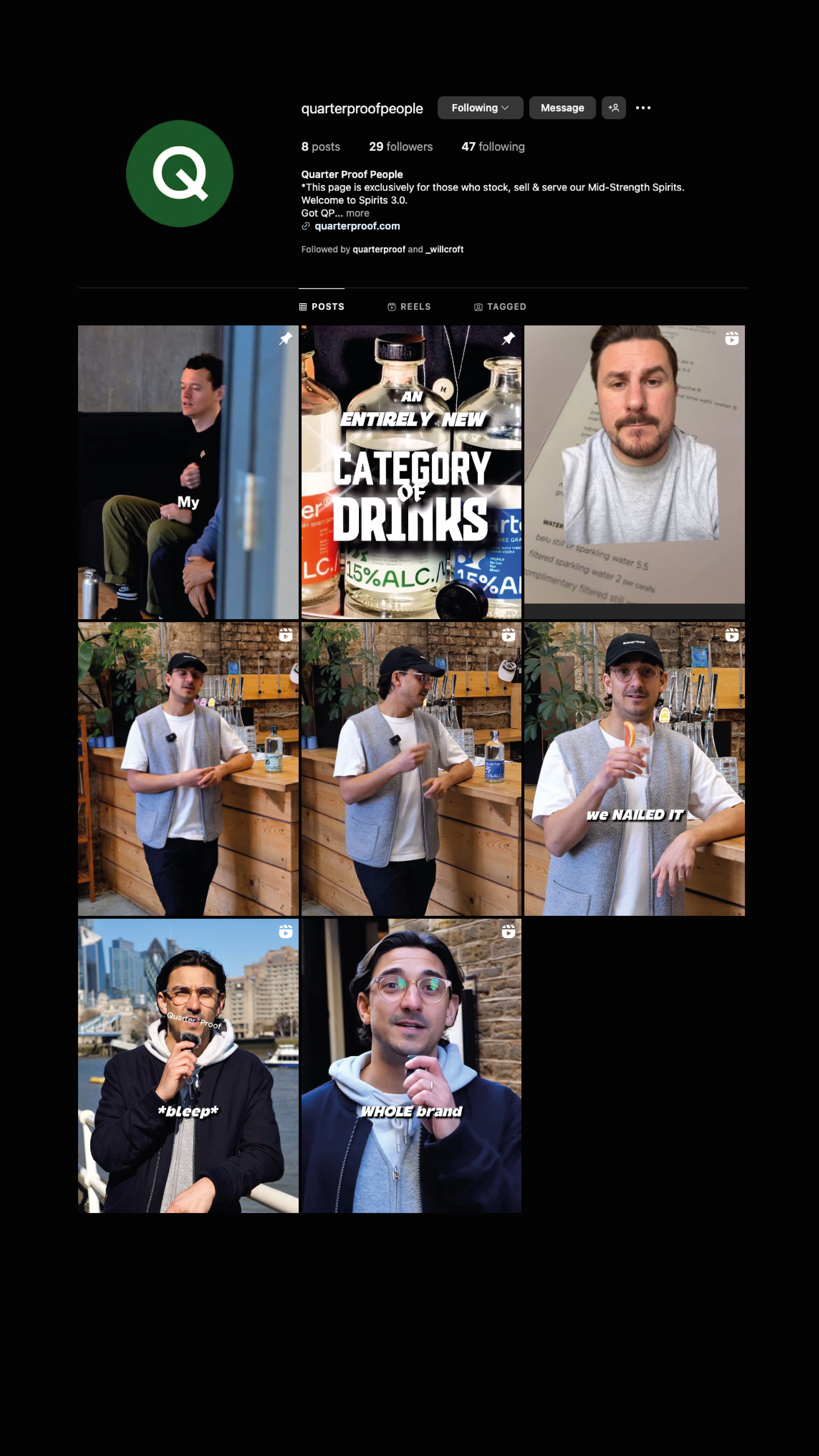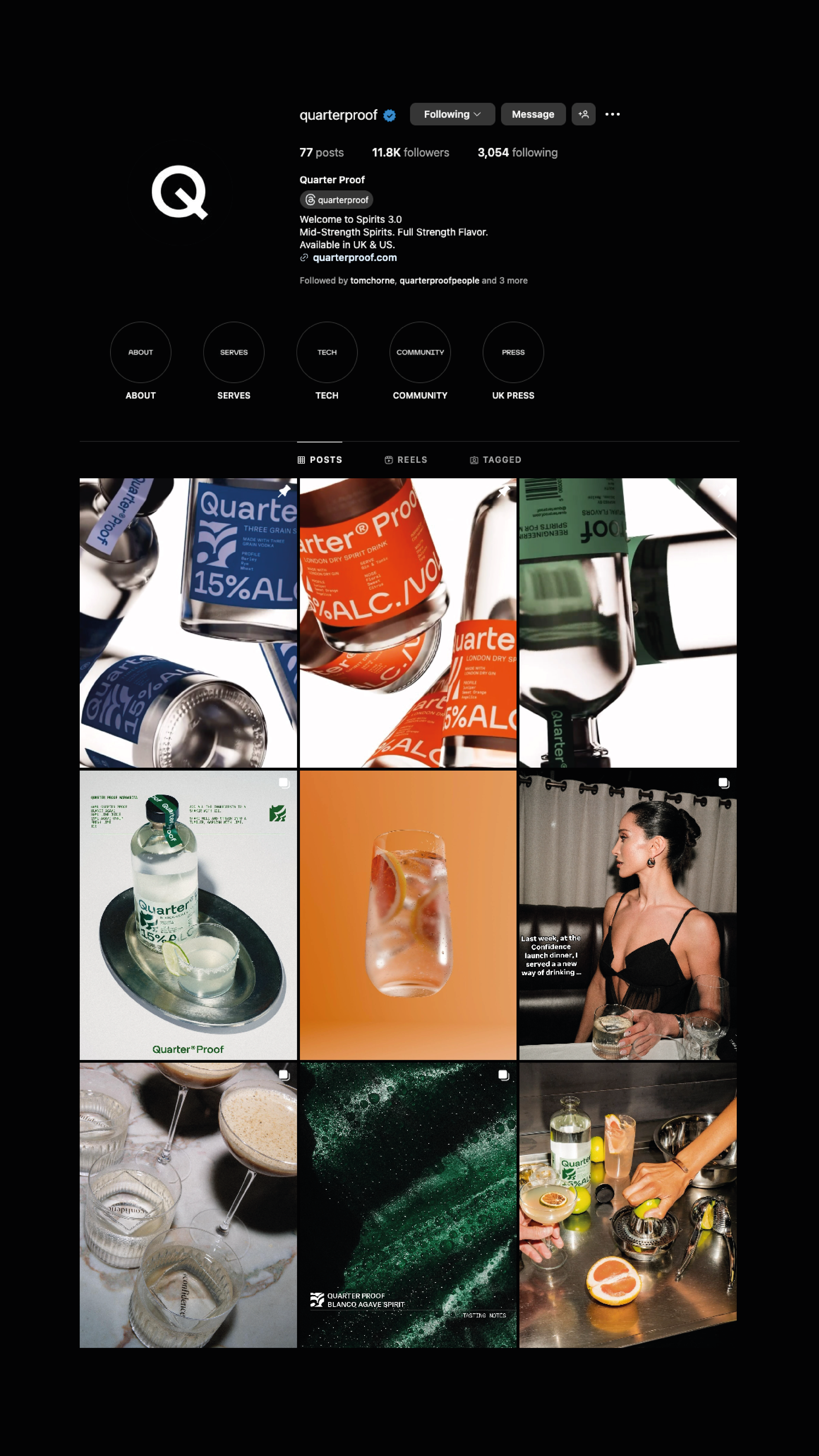 Quarter Proof is a forward-thinking drinks brand creating mid-strength spirits that challenge traditional alcohol norms—known for their sleek branding and bold mission to redefine moderation.